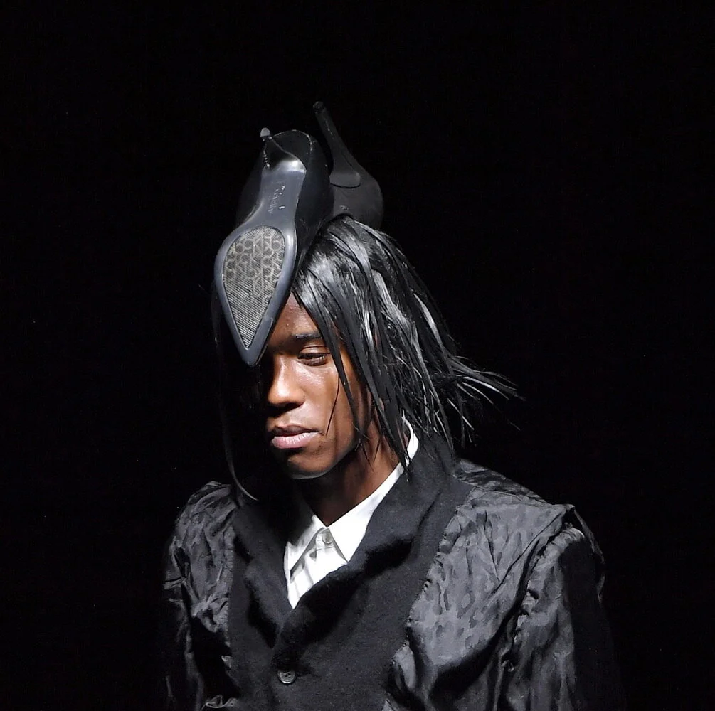 Rei Kawakubo unveils her Homme Plus AW21 collection, made in collaboration with celebrated American artist Willie Cole. “I am constantly looking for strong images and I suddenly had the idea to ask Willie if he would consider making headpieces instead of face masks,” says the designer, as the pair came together to adorn the heads of each model in elegant clusters of black pumps. Cole’s original sculptures also cropped up in the collection, via an all-over print that coated elongated shirts, padded blazers and traditional Changshan jackets. Kawakubo wanted to use this season as a testament that even in this bleak moment in time, creativity can still arise.